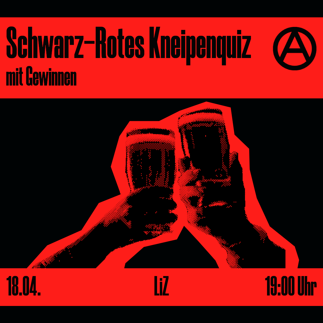 Zum wievielten Mal findet die Schwarz-Rote 1. Mai Demo dieses Jahr nochmal statt? Und wann wurde eigentlich Emma Goldman geboren? Fragen über Fragen. Wir hoffen, ihr habt Antworten. Entspannt auf ein Getränk, nebenbei was dazulernen oder aktiv mitraten: Kommt zum Kneipenabend und stellt euch alleine oder im Team unseren schwarz-roten Quizfragen. Zu gewinnen gibts auch was!